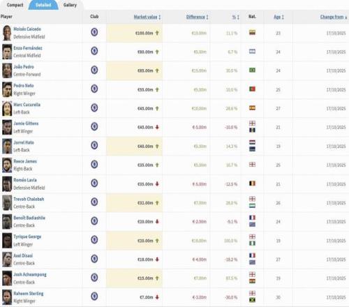 北京时间10月17日,德转更新了英超球员身价,切尔西身价变动球员如下。